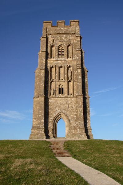 Glastonbury Tor (Ruine des Turms von St. Michael’s) ist ein 158 m hoher, tropfenförmiger Hügel in Glastonbury. Tor ist ein Wort keltischen Ursprungs, das „konischer Hügel“ (bedeutet Berg, Erde) bedeutet. Es gibt Beweise für hölzerne Hütten aus der keltischen und römischen Zeit. Der keltische Name des Tores war Ynis Witrin, das heißt Glasinsel. Zu dieser Zeit war die Ebene geflutet, die Insel wurde bei Ebbe zur Halbinsel.